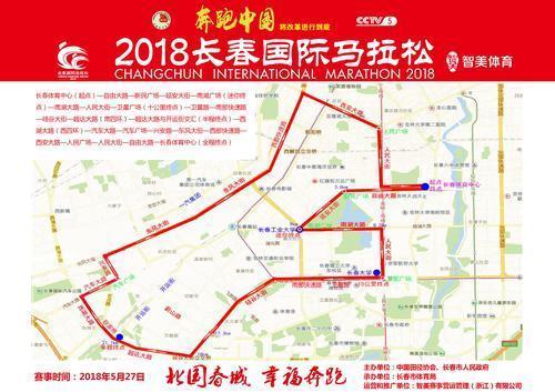 2018长春国际马拉松路线:长春体育中心(起点)→自由大路→新民广场→延安大街→南湖广场(迷你终点)→南湖大路→人民大街→卫星广场(十公里终点)→卫星路→南部快速路→硅谷大街→超达大路(南四环)→超达大路与开运街交汇(半程终点)→西湖大路(西四环)→汽车大路→汽车广场→兴安路→东风大街→西部快速路→西安大路→人民广场→人民大街→自由大路→长春体育中心(全程终点)。