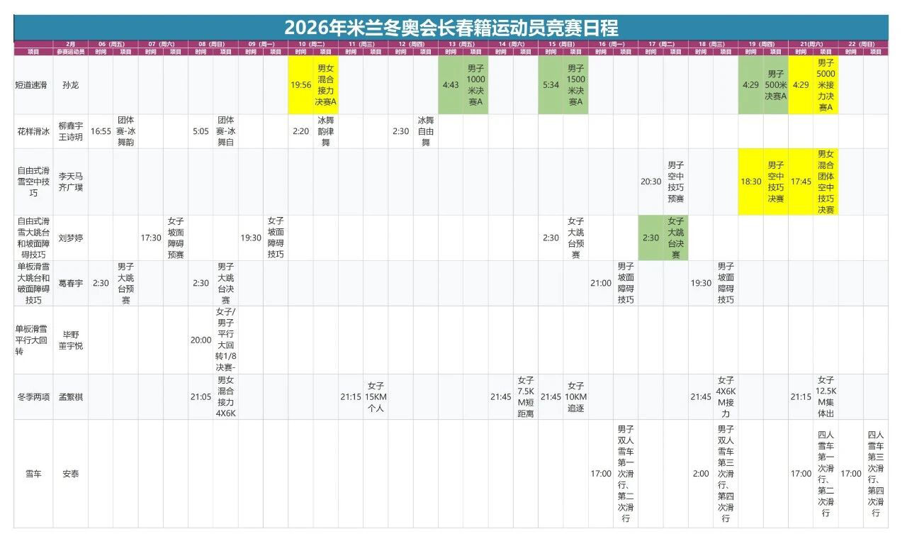 2026年米兰冬奥会长春籍运动员竞赛日程